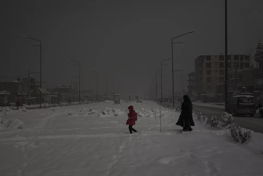 En una mañana muy contaminada, una madre camina con su hija por una zona nevada de Kabul, Afganistán.