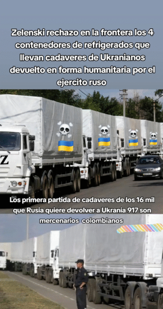 De acuerdo a la información que circula en internet, el ‘presidente ucraniano’ Volodímir Zelenski habría rechazado en la frontera el ingreso de cuatro camiones refrigerados que transportaban cadáveres de soldados ucranianos.